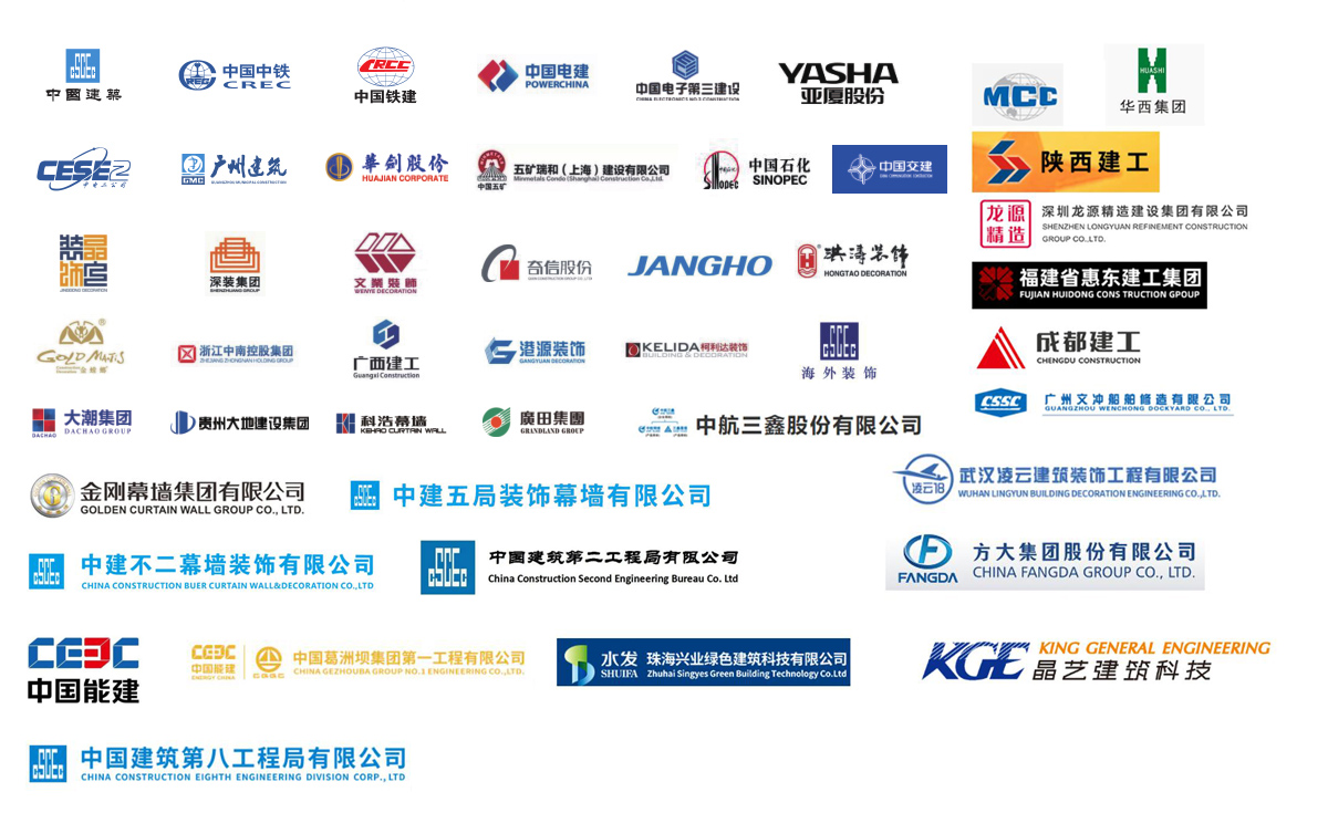 公司參建了諸多大型項(xiàng)目工程,如港珠澳大橋、珠海國(guó)際航展、深圳國(guó)際會(huì)展中心、廣州白云機(jī)場(chǎng)、西安全運(yùn)會(huì)場(chǎng)館、成都東安湖大運(yùn)會(huì)場(chǎng)館、樂(lè)山奧體中心、洛陽(yáng)奧體中心、增城富士康廠房、惠州中海油、陽(yáng)江核電站、珠三角各地鐵線(xiàn)、高鐵站、廣西桂林機(jī)場(chǎng)、廣西柳州文化廣場(chǎng)、四川成都天府機(jī)場(chǎng)、海南海口美蘭機(jī)場(chǎng)、西安絲路會(huì)展中心、惠州北站等等。與中國(guó)建筑、中國(guó)中鐵、中國(guó)鐵建、中國(guó)電建、中國(guó)交建、中國(guó)中冶、中國(guó)能建、廣東建筑、廣西建工、廣州建筑等大型國(guó)有企業(yè)下屬公司及江河幕墻、金螳螂裝飾等各大建筑裝飾、幕墻裝飾公司達(dá)成長(zhǎng)期友好合作關(guān)系。
